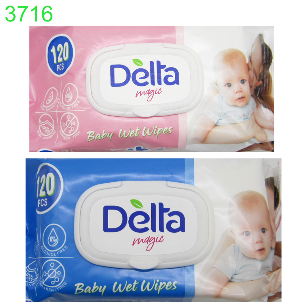 Мокри кърпи Delta Baby Wet Wipes са меки,нежни и плътни.Създадени специално за почистването и овлажняването на кожата.Хипоалергични и без алкохол.Съдържащите се компоненти имат успокояващ,омекотяващ и освежаващ ефект. Голям макси пакет с капак съдържащ 120 броя мокри кърпи.